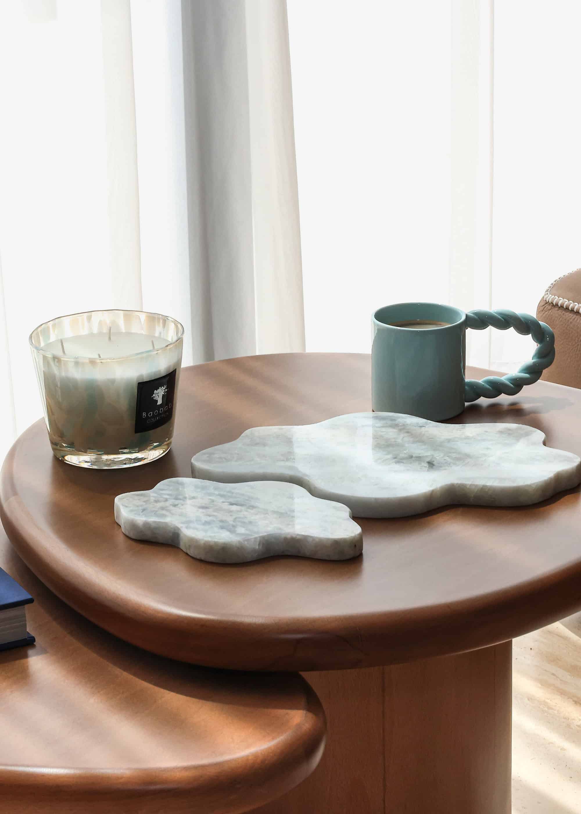 Sold as a set, the cloud trays are crafted from Azul cielo marble, each tray features natural veining that makes every piece unique. Its versatile design is perfect for jewelry, perfumes, candles, trinkets, or everyday essentials - styled on a vanity, coffee table, entryway console, bedside table, or open shelving. Durable and easy to care for, wipe clean with a soft damp cloth and avoid harsh or acidic cleaners.