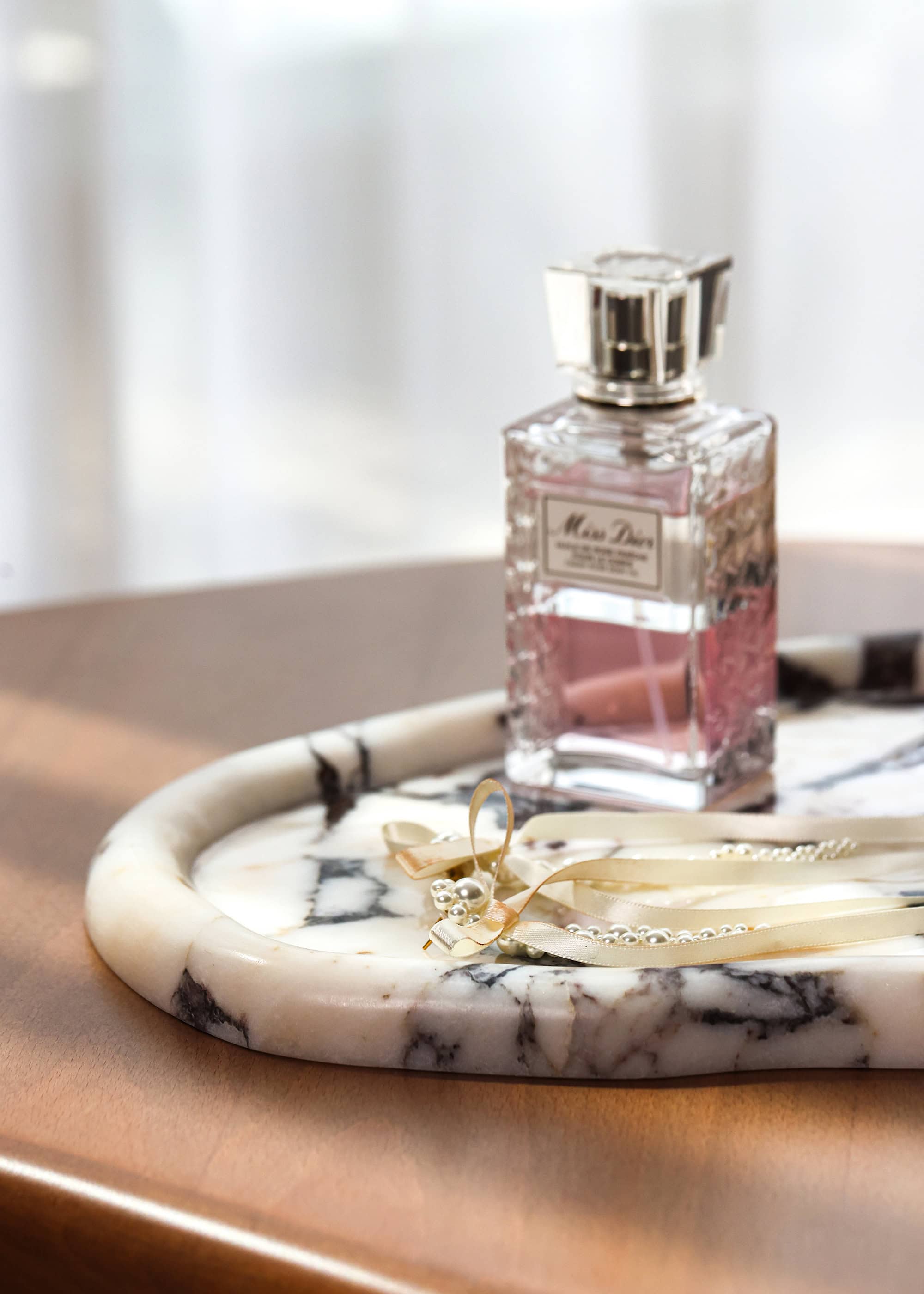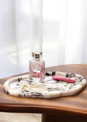 Crafted from Calacatta Viola marble, each tray features natural veining that makes every piece unique. Its versatile design is perfect for jewelry, perfumes, candles, trinkets, or everyday essentials - styled on a vanity, coffee table, entryway console, bedside table, or open shelving. Durable and easy to care for, wipe clean with a soft damp cloth and avoid harsh or acidic cleaners.