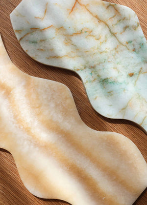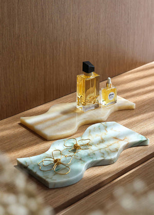 Sold as a set, the wave trays are crafted from parrot green and onyx marbles. Their versatile design is perfect for jewelry, perfumes, candles, trinkets, or everyday essentials - styled on a vanity, coffee table, entryway console, bedside table, or open shelving. Durable and easy to care for, wipe clean with a soft damp cloth and avoid harsh or acidic cleaners.